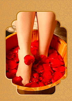 Zuerst lassen wir die Füße fünf Minuten im warmen Rosen-Wasser liegen,